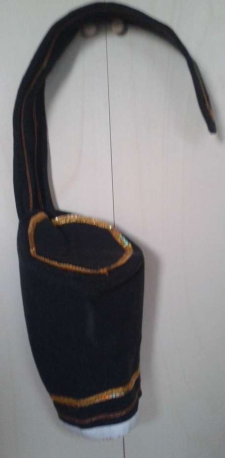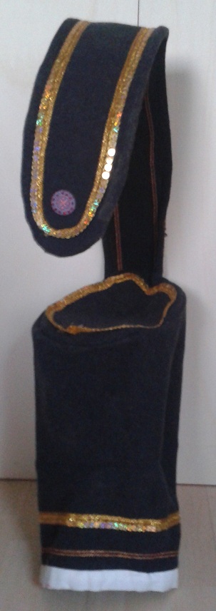 - Ein selber genähter Fantasiehut um Drahtunterkonstrunktion. Wippt und dreht sehr stark, daher ist er eher schwierig zu tragen. An einer Stelle kommt die Tragekonstruktion inzwischen aus dem Futterstoff. Daher muss man beim an und ausziehen auch auf passen. Der Hut passt gut bei Hutgröße 59-60