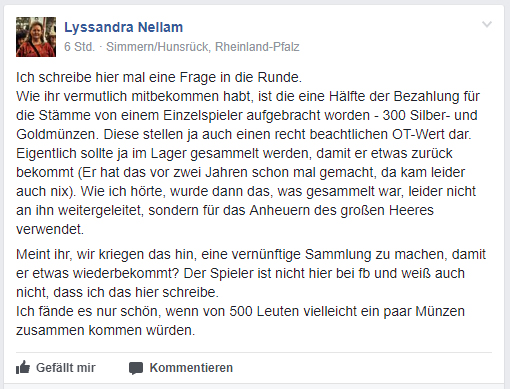 Nachdem dieser Post von Lyssandra gepostet wurde im Faceboook, entbrannte eine wilde Diskussion über den Verlauf der Bezahlung der Stämme.