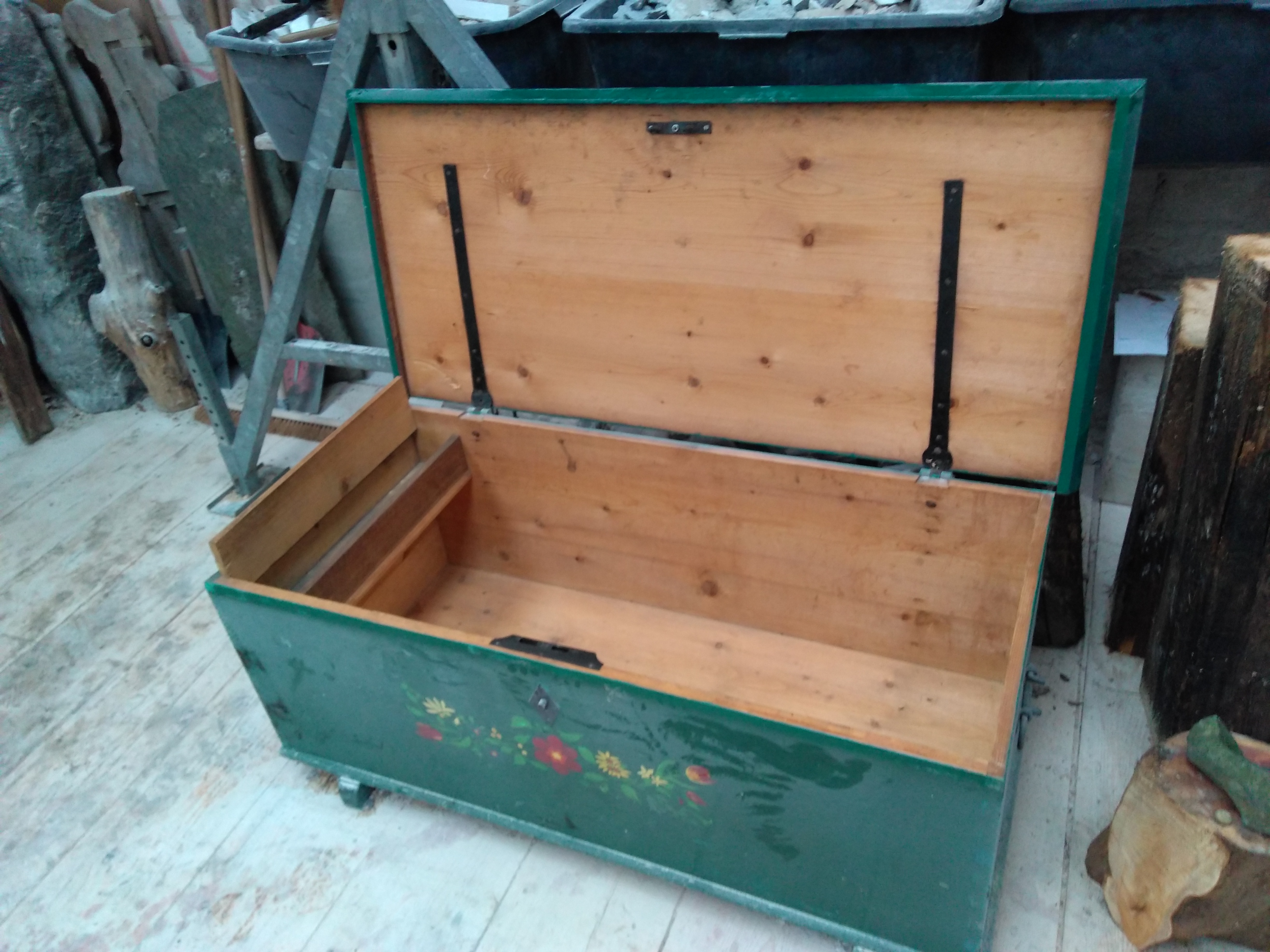 Aus unserem Haus haben wir eine Vollholztruhe zum verschenken. Sie ist 60/60/120 cm groß und komisch bemalt.